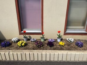 利用者様が植えてくださったビオラとチューリップが満開です
